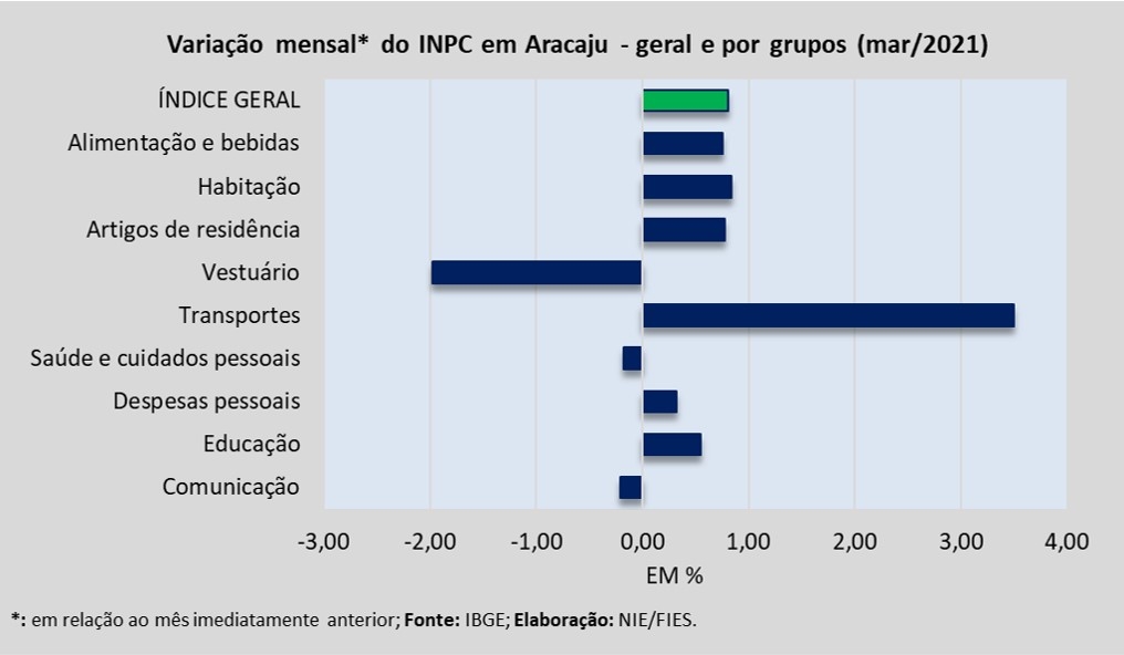 Dentre os nove grupos de produtos e serviços que foram pesquisados para medir o comportamento dos preços, em Aracaju, verificou-se que assinalaram aumento nos preços, no período analisado, os grupos de Transportes (+4,73%), Habitação (+0,93%), Artigos de residência (+0,90%), Alimentação e Bebidas (+0,70%), Educação (+0,49%), Despesas pessoais (+0,10%) e Saúde e cuidados pessoais (+0,03%). ![]()