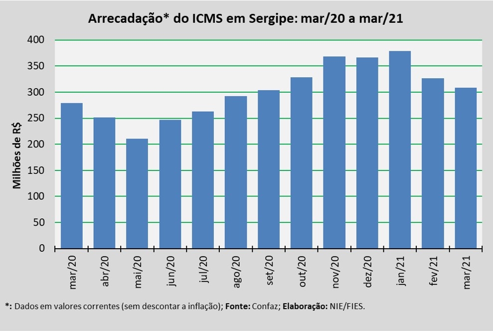 Análise realizada pelo Boletim Sergipe Econômico, parceria do Núcleo de Informações Econômicas da Federação das Indústrias do Estado de Sergipe (FIES) e do Departamento de Economia da UFS, com base nos dados do Conselho Nacional de Política Fazendária (Confaz), apontou que a arrecadação do Imposto sobre Circulação de Mercadorias e Prestação de Serviços (ICMS), em Sergipe, somou aproximadamente R$ 308,8 milhões, em março deste ano.