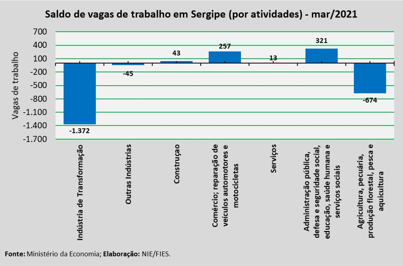 Análise realizada pelo Boletim Sergipe Econômico, parceria do Núcleo de Informações Econômicas da Federação das Indústrias do Estado de Sergipe (FIES) e do Departamento de Economia da UFS, com base nos dados do Novo Cadastro Geral de empregados e desempregados (Caged) da Secretaria de Trabalho do Ministério da Economia, revelou que houve saldo negativo de 1.457 vagas de emprego com carteira assinada no estado, em março deste ano. O saldo decorre da diferença entre 8.881 admissões e 7.424 desligamentos, no período analisado.