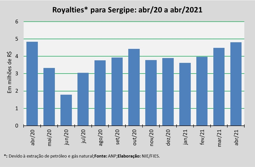 Análise realizada pelo Boletim Sergipe Econômico, parceria do Núcleo de Informações Econômicas da Federação das Indústrias do Estado de Sergipe (FIES) e do Departamento de Economia da UFS, com base nos dados da Agência Nacional do Petróleo, Gás Natural e Biocombustíveis (ANP), revelou que o pagamento de royalties ao Estado de Sergipe, referentes à extração de petróleo e gás natural do mês de fevereiro último, ficou em aproximadamente R$ 4,8 milhões. O valor, segundo a ANP, foi creditado em abril.