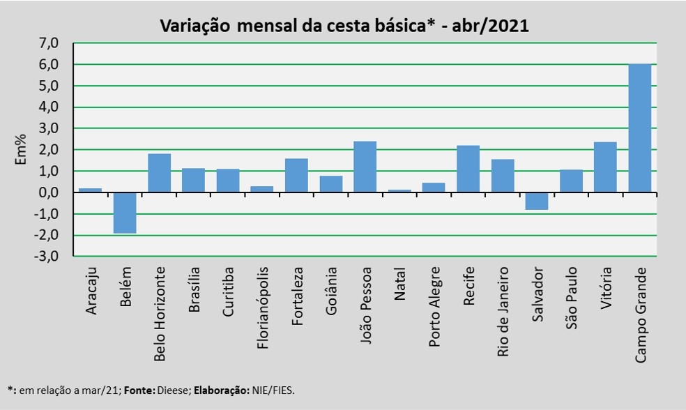 No mês analisado, levando-se em consideração a comparação com o mês anterior (março/2021), observou-se aumento no valor da cesta em quase todas as capitais pesquisadas, com destaque para Campo Grande (+6,0%), João Pessoa (+2,4%), Vitória (+2,4%), Recife (+2,2%) e Belo Horizonte (+1,8%).