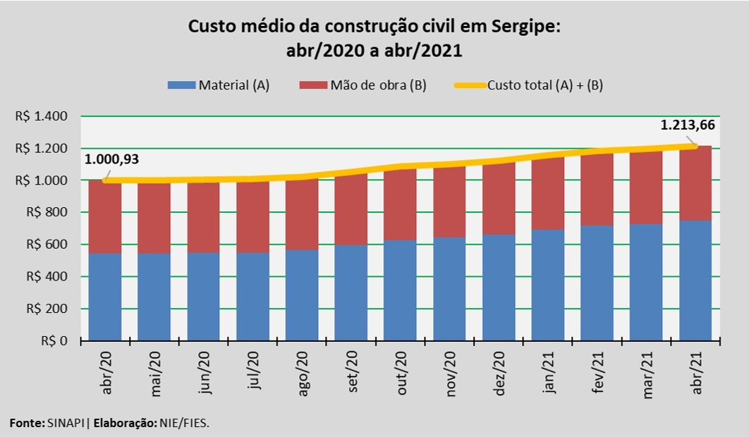 Análise realizada pelo Boletim Sergipe Econômico, parceria do Núcleo de Informações Econômicas da Federação das Indústrias do Estado de Sergipe (FIES) e do Departamento de Economia da UFS, com base nos dados do Sistema Nacional de Pesquisa de Custos e Índices da Construção Civil – SINAPI, uma produção conjunta do IBGE e da Caixa Econômica Federal, revelou que o custo médio da construção em Sergipe, por metro quadrado (m²), em abril deste ano, registrou aumento de 1,6%, quando comparado com o mês imediatamente anterior, março último. Na comparação com o mês de abril do ano passado, o custo registrado apresentou aumento de 21,3%.