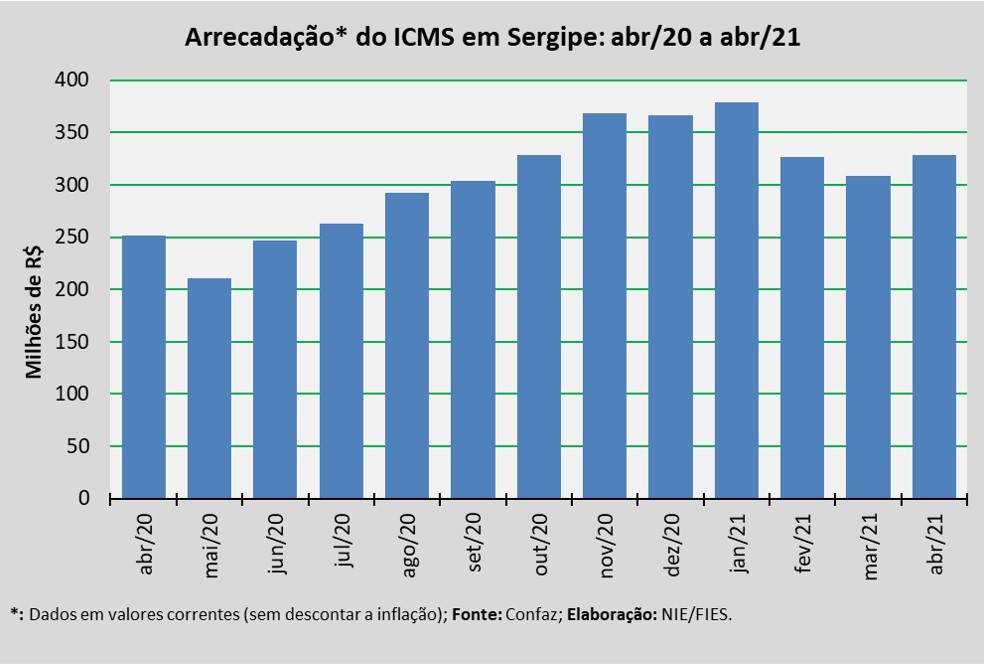 Análise realizada pelo Boletim Sergipe Econômico, parceria do Núcleo de Informações Econômicas da Federação das Indústrias do Estado de Sergipe (FIES) e do Departamento de Economia da UFS, com base nos dados do Conselho Nacional de Política Fazendária (Confaz), apontou que a arrecadação do Imposto sobre Circulação de Mercadorias e Prestação de Serviços (ICMS), em Sergipe, somou R$ 328,5 milhões, em abril deste ano.