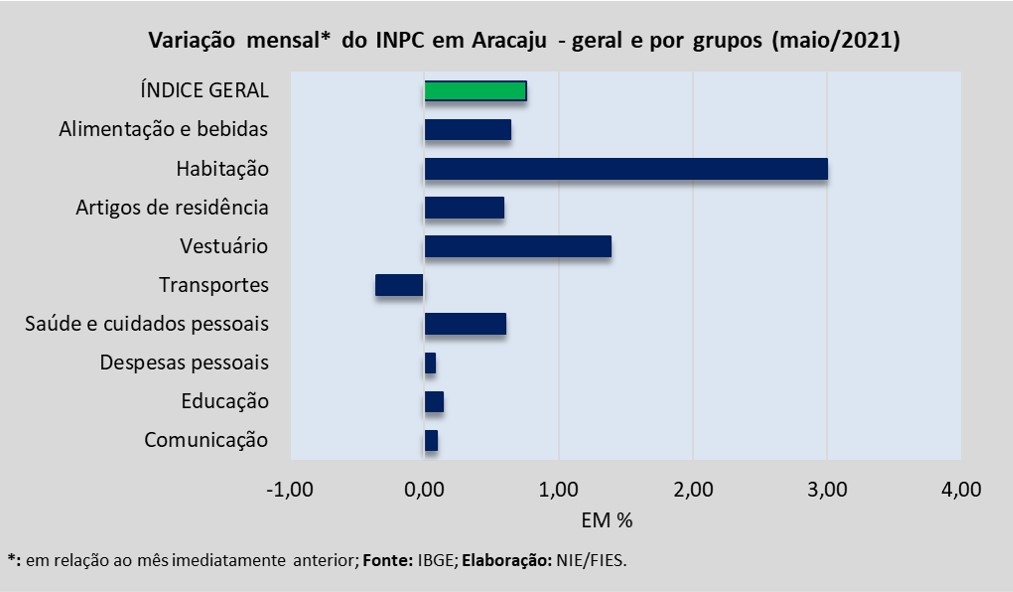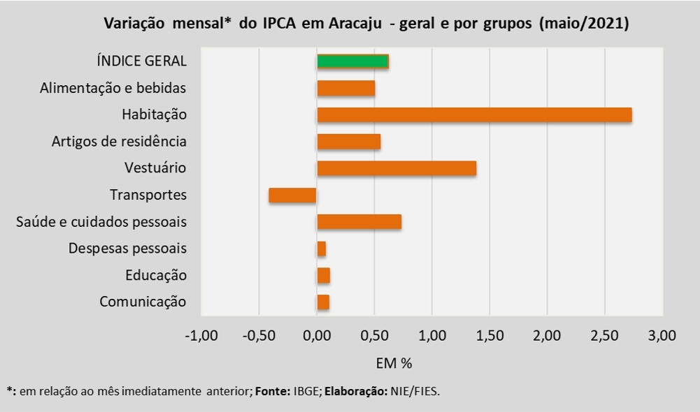 Dentre os nove grupos de produtos e serviços que foram pesquisados para medir o comportamento dos preços, em Aracaju, quase todos assinalaram aumento de preços, no período analisado, com destaque para o grupo de Habitação, ao registrar inflação de 2,73%. Em seguida ficaram os grupos de Vestuário (+1,38%), Saúde e cuidados pessoais (+0,73%), Artigos de residência (+0,55%), Alimentação e Bebidas (+0,50%), Educação (+0,11%), Comunicação (+0,10%) e Despesas pessoais (+0,07%).