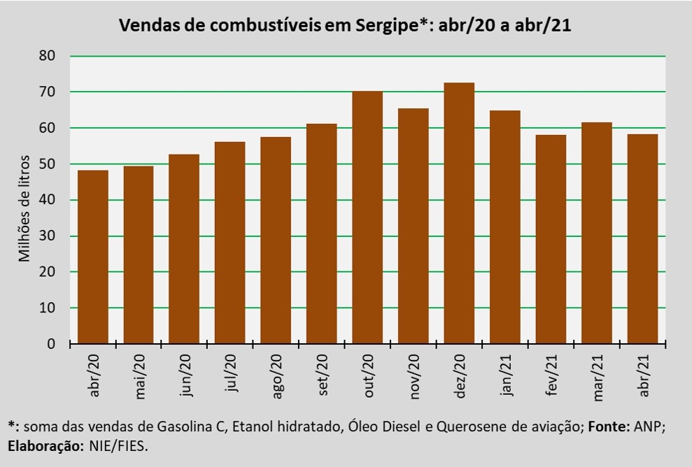 Análise realizada pelo Boletim Sergipe Econômico, parceria do Núcleo de Informações Econômicas da Federação das Indústrias do Estado de Sergipe (FIES) e do Departamento de Economia da UFS, com base nos dados da Agência Nacional do Petróleo, Gás Natural e Biocombustíveis (ANP), indicou que as vendas totais de combustíveis em Sergipe, em abril deste ano, totalizaram 58,2 milhões de litros, assinalando alta de 20,9% quando comparado a abril de 2020. Em relação ao mês imediatamente anterior, março último, as vendas recuaram 5,6%.