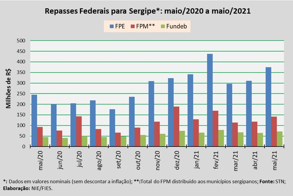Análise realizada pelo Boletim Sergipe Econômico, parceria do Núcleo de Informações Econômicas da Federação das Indústrias do Estado de Sergipe (FIES) e do Departamento de Economia da UFS, com base nos dados da Secretaria do Tesouro Nacional (STN), indicou que o repasse do Fundo de Participação dos Estados (FPE) para Sergipe, no quinto mês do ano corrente, foi de aproximadamente R$ 374,4 milhões.