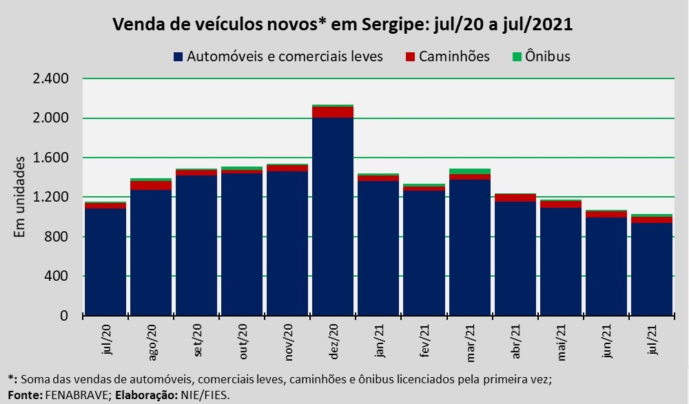 Análise realizada pelo Boletim Sergipe Econômico, parceria do Núcleo de Informações Econômicas (NIE) da Federação das Indústrias do Estado de Sergipe (FIES) e do Departamento de Economia da UFS, com base nos dados da Federação Nacional da Distribuição de Veículos Automotores (FENABRAVE), apontou que as vendas de veículos novos no estado, no sétimo mês do ano, totalizaram 1.026 unidades.