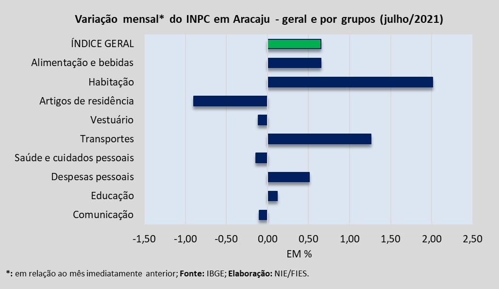 Dentre os nove grupos de produtos e serviços que foram pesquisados para medir o comportamento dos preços, em Aracaju, seis assinalaram aumento de preços no período analisado, com destaque para o grupo de Habitação, ao registrar inflação de 1,97%. Em seguida ficaram os grupos de Transportes (+0,88%), Alimentação e Bebidas (+0,66%), Despesas pessoais (+0,49%), Vestuário (+0,06%) e Educação (+0,06%).