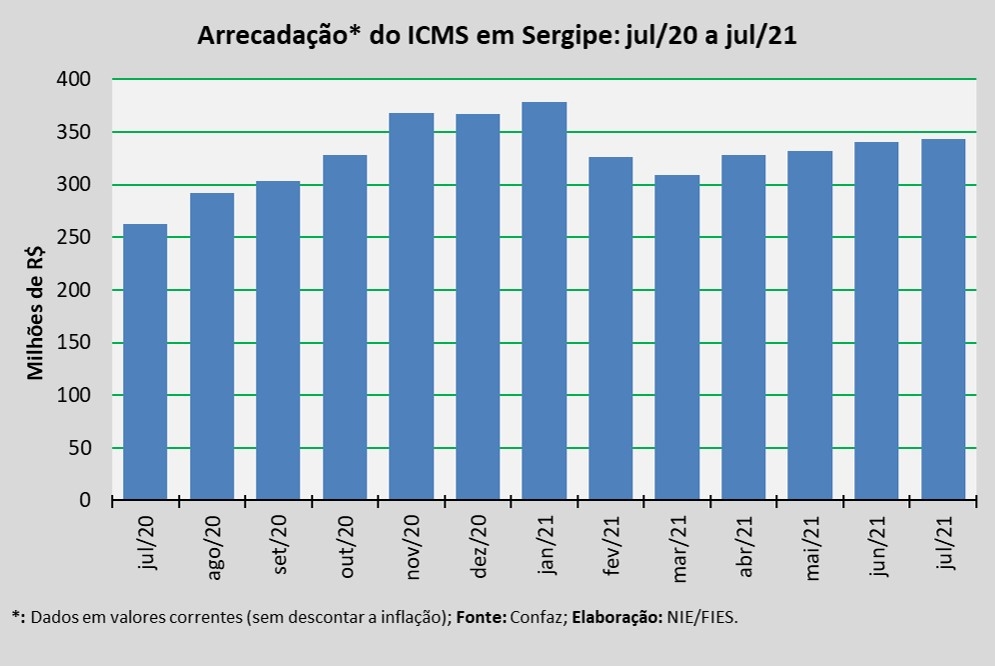 Análise realizada pelo Boletim Sergipe Econômico, parceria do Núcleo de Informações Econômicas da Federação das Indústrias do Estado de Sergipe (FIES) e do Departamento de Economia da UFS, com base nos dados do Conselho Nacional de Política Fazendária (Confaz), apontou que a arrecadação do Imposto sobre Circulação de Mercadorias e Prestação de Serviços (ICMS), em Sergipe, somou aproximadamente R$ 343,4 milhões, em julho deste ano.