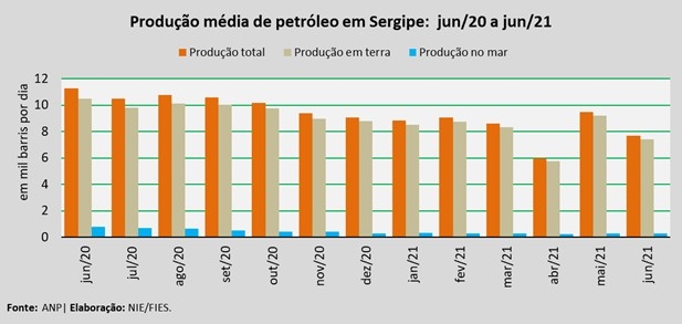 Análise realizada pelo Boletim Sergipe Econômico, parceria do Núcleo de Informações Econômicas da Federação das Indústrias do Estado de Sergipe (FIES) e do Departamento de Economia da UFS, com base nos dados da Agência Nacional do Petróleo, Gás Natural e Biocombustíveis (ANP), revelou que a produção de petróleo no estado, em junho deste ano, alcançou, em média, 7,7 mil barris por dia (bpd), registrando queda de 18,9% em relação à produção do mês anterior, maio último. No comparativo com junho de 2020, assinalou redução de 31,6%.