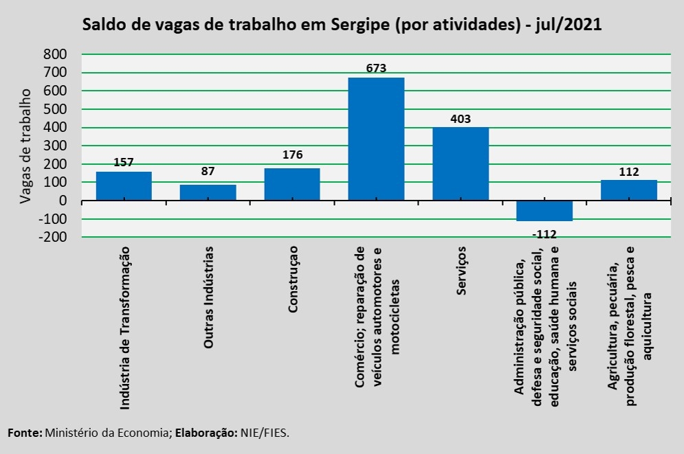 No sétimo mês de 2021, o grupamento de Comércio e reparação de veículos automotores e motocicletas destacou-se, com a abertura de 673 postos de trabalho. Em seguida ficaram os grupamentos de: Serviços (+403 vagas); Construção (+176 vagas); Indústria de Transformação (+157 vagas); Agricultura, pecuária, produção florestal, pesca e aquicultura (+112 vagas); e, Outras Indústrias (+87 vagas).