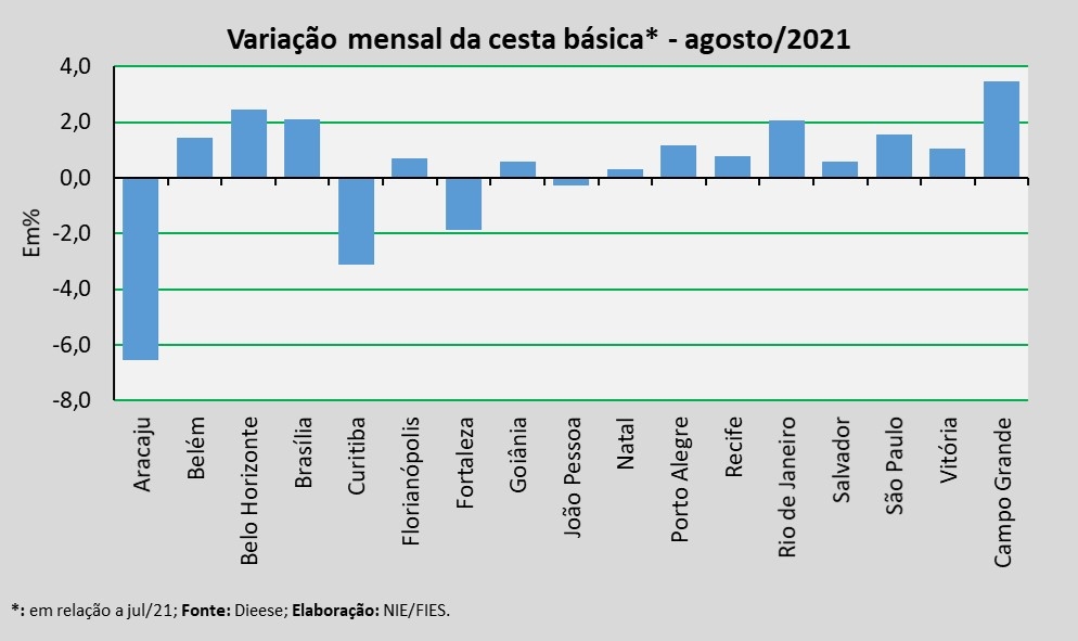 No mês analisado, levando-se em consideração a comparação com o mês anterior (julho/2021), observou-se aumento no valor da cesta em treze das dezessete capitais pesquisadas. Destacaram-se Campo Grande (+3,5%), Belo Horizonte (+2,4%), Brasília (+2,1%), Rio de Janeiro (+2,1%) e São Paulo (+1,6%).