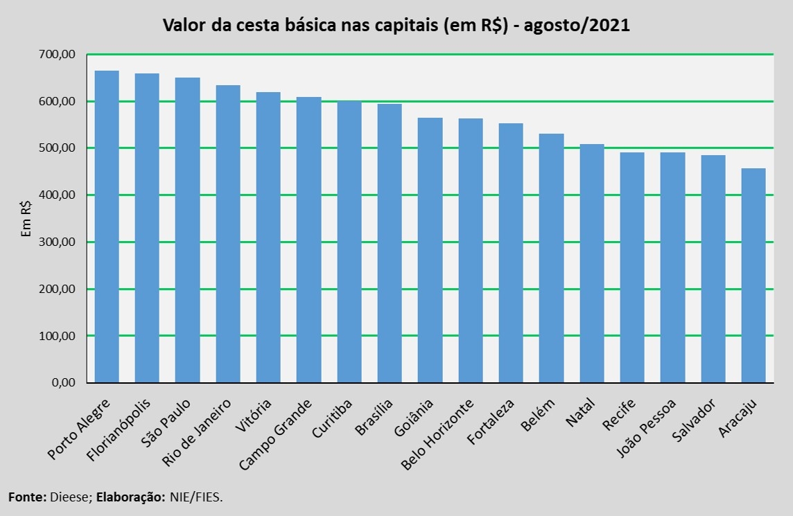 Em termos absolutos, a capital com a cesta mais cara, no mês analisado, foi Porto Alegre (R$ 664,67), seguida por Florianópolis (R$ 659,00) e São Paulo (R$ 650,50). Já as capitais com as cestas mais baratas foram Aracaju (R$ 456,40), seguida de Salvador (R$ 485,44) e João Pessoa (R$ 490,93).