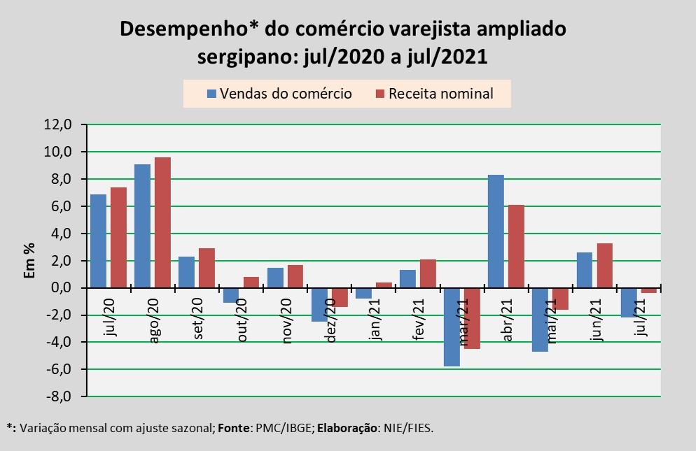 Análise realizada pelo Boletim Sergipe Econômico, parceria do Núcleo de Informações Econômicas da Federação das Indústrias do Estado de Sergipe (FIES) e do Departamento de Economia da UFS, com base nos dados da Pesquisa Mensal do Comércio (PMC) do IBGE, apontou que as vendas do comércio varejista ampliado sergipano, em julho deste ano, assinalaram redução de 2,2%, em relação ao mês imediatamente anterior (junho/2021), na série com ajuste sazonal (método que uniformiza os períodos de comparação). No comparativo com julho do ano passado, observou-se aumento de 7,0%.