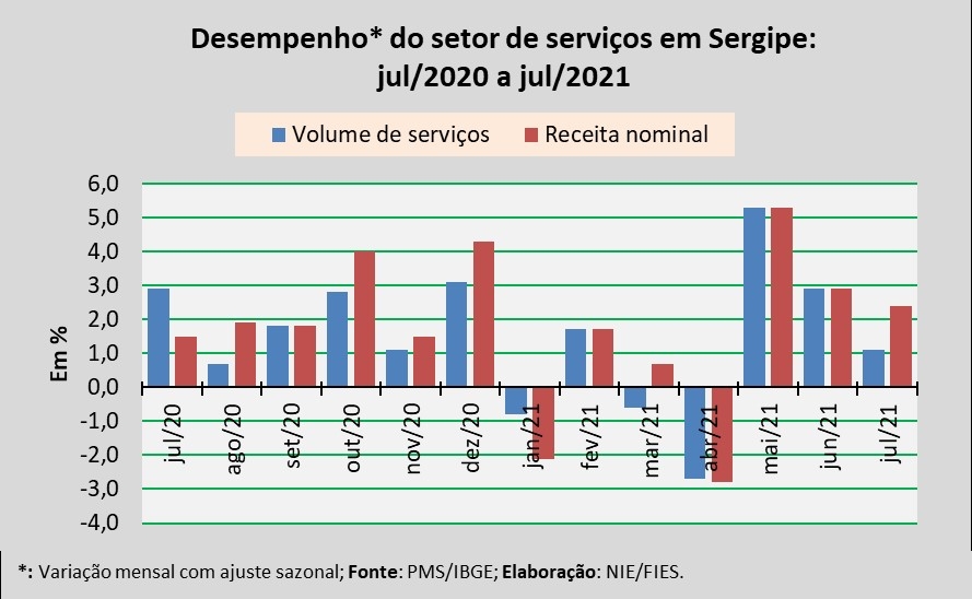 Análise realizada pelo Boletim Sergipe Econômico, parceria do Núcleo de Informações Econômicas da Federação das Indústrias do Estado de Sergipe (FIES) e do Departamento de Economia da UFS, com base nos dados da Pesquisa Mensal de Serviços (PMS) do IBGE, revelou que, em julho deste ano, o setor de serviços em Sergipe apresentou aumento de 1,1% no volume de serviços prestados, em relação ao último mês de junho, na série com ajuste sazonal (método utilizado para uniformizar os períodos de comparação). Na comparação com julho do ano passado, o volume de serviços assinalou crescimento de 17,6%.