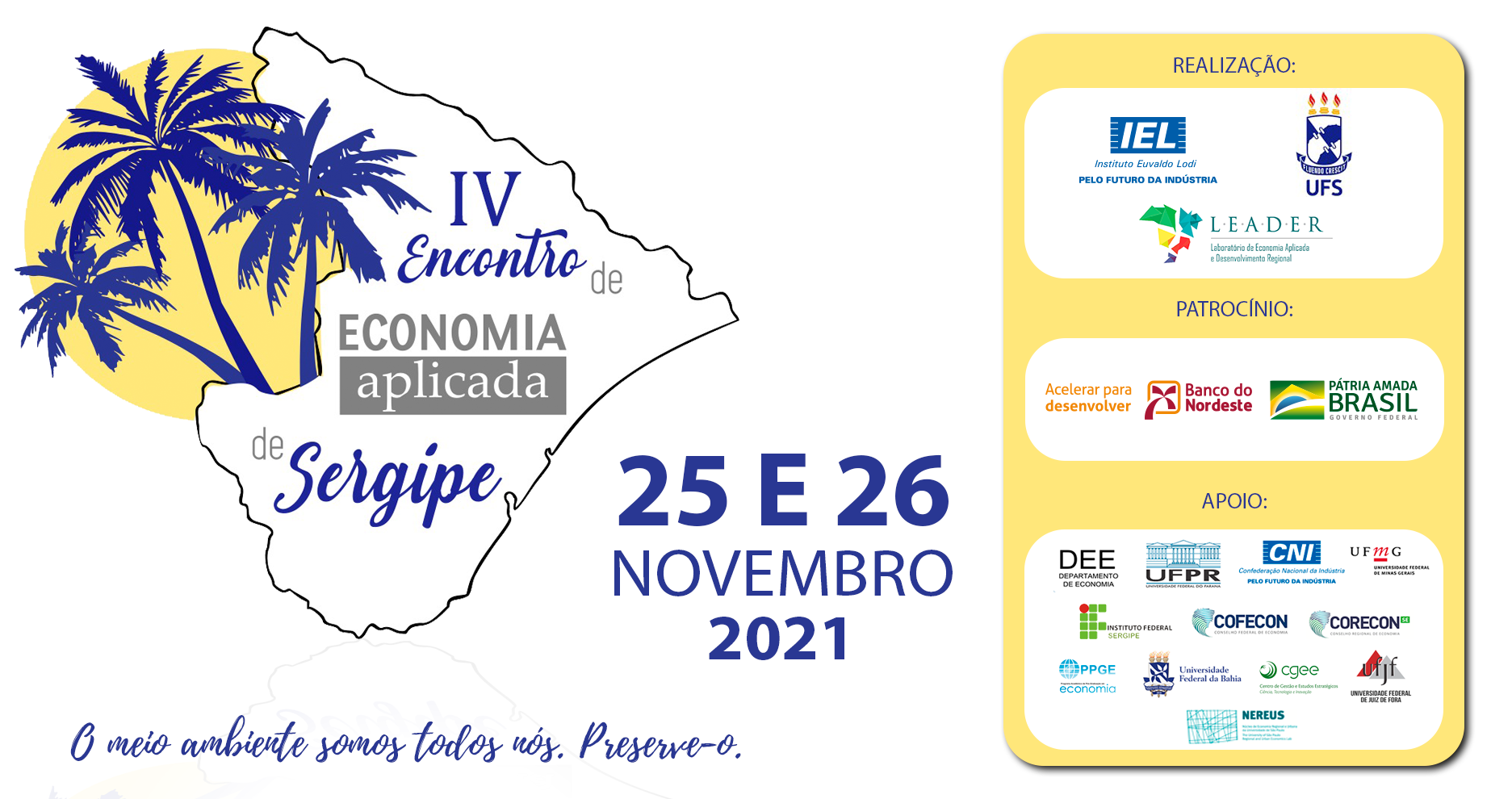 O IV Encontro de Economia Aplicada de Sergipe (IV EEA-SE), acontecerá nos dias 25 e 26 de novembro de 2021, e é fruto da parceria entre Federação das Indústrias do Estado de Sergipe (FIES), por meio do Instituto Euvaldo Lodi (IEL), e a Universidade Federal de Sergipe (UFS), por meio do Laboratório de Economia Aplicada de Desenvolvimento Regional (LEADER), do Programa Acadêmico de Pós-Graduação em Economia (PPGE) e do Departamento de Economia (DEE). Em decorrência da pandemia de Covid-19, o IV EEA-SE ocorrerá no formato online.