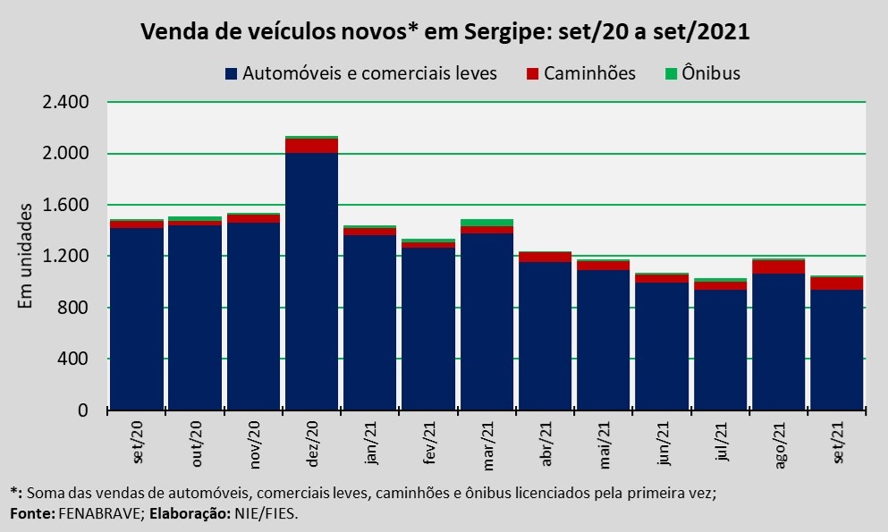 Análise realizada pelo Boletim Sergipe Econômico, parceria do Núcleo de Informações Econômicas (NIE) da Federação das Indústrias do Estado de Sergipe (FIES) e do Departamento de Economia da UFS, com base nos dados da Federação Nacional da Distribuição de Veículos Automotores (FENABRAVE), apontou que as vendas de veículos novos no estado, no nono mês do ano, totalizaram 1.051 unidades.