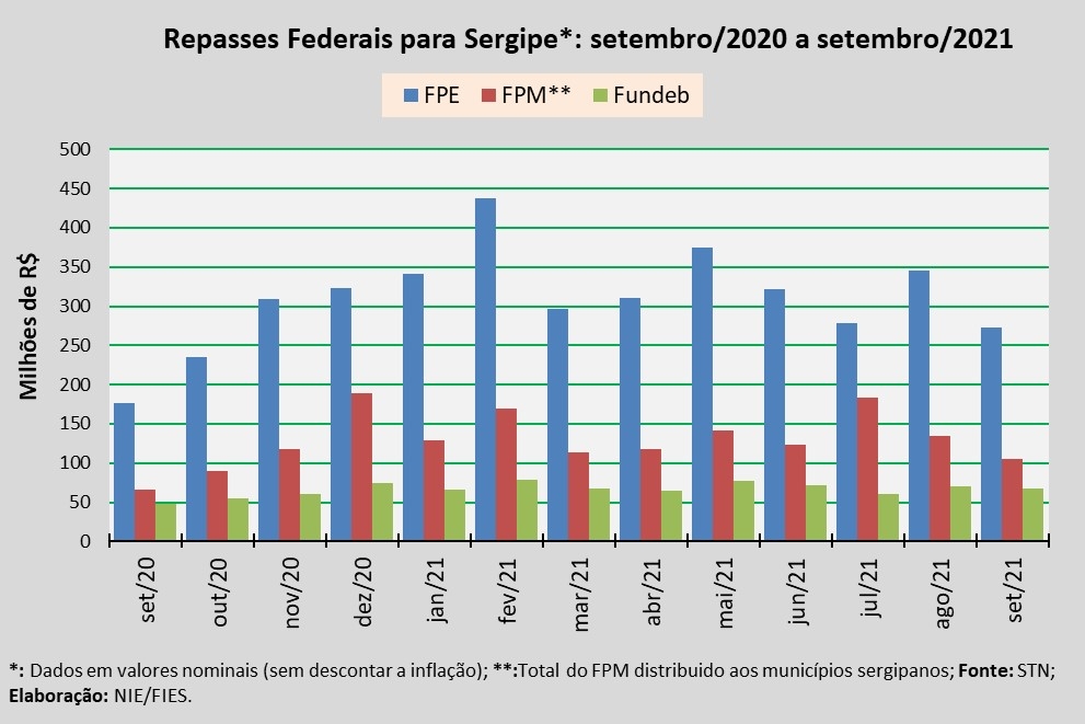 Análise realizada pelo Boletim Sergipe Econômico, parceria do Núcleo de Informações Econômicas da Federação das Indústrias do Estado de Sergipe (FIES) e do Departamento de Economia da UFS, com base nos dados da Secretaria do Tesouro Nacional (STN), indicou que o repasse do Fundo de Participação dos Estados (FPE) para Sergipe, em setembro do ano corrente, foi de aproximadamente R$ 273,2 milhões.