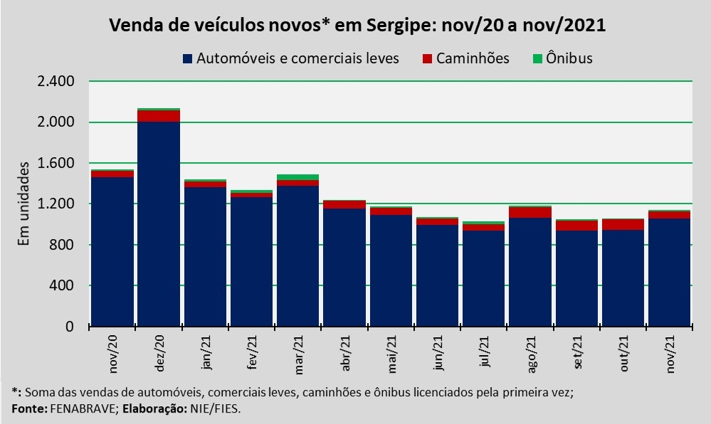 Análise realizada pelo Núcleo de Informações Econômicas (NIE) da Federação das Indústrias do Estado de Sergipe (FIES), com base nos dados da Federação Nacional da Distribuição de Veículos Automotores (FENABRAVE), apontou que as vendas de veículos novos no estado, no décimo primeiro mês do ano, totalizaram 1.137 unidades.