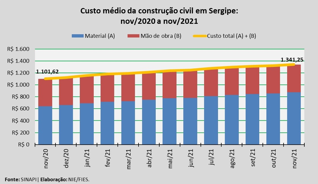 Análise realizada pelo Núcleo de Informações Econômicas da Federação das Indústrias do Estado de Sergipe (FIES), com base nos dados do Sistema Nacional de Pesquisa de Custos e Índices da Construção Civil – SINAPI, uma produção conjunta do IBGE e da Caixa Econômica Federal, revelou que o custo médio da construção em Sergipe, por metro quadrado (m²), em novembro deste ano, registrou aumento de 1,5%, quando comparado com o mês imediatamente anterior, outubro último. Na comparação com o mês de novembro do ano passado, o custo registrado apresentou aumento de 21,7%.
