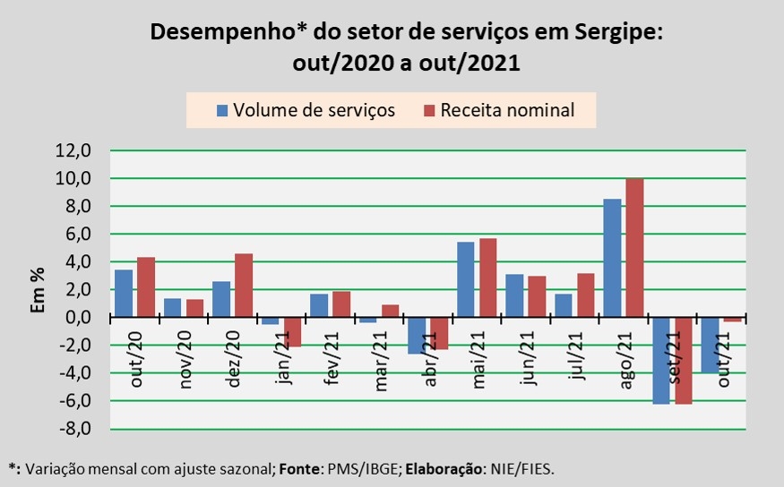 Análise realizada pelo Núcleo de Informações Econômicas da Federação das Indústrias do Estado de Sergipe (FIES), com base nos dados da Pesquisa Mensal de Serviços (PMS) do IBGE, revelou que, em outubro deste ano, o setor de serviços em Sergipe apresentou redução de 4,0% no volume de serviços prestados, em relação ao último mês de setembro, na série com ajuste sazonal (método utilizado para uniformizar os períodos de comparação). Na comparação com outubro do ano passado, o volume de serviços assinalou crescimento de 10,6%.