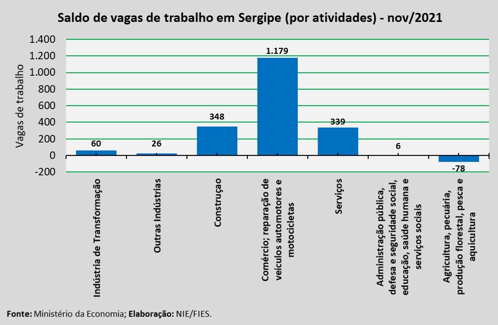 Análise realizada pelo Núcleo de Informações Econômicas da Federação das Indústrias do Estado de Sergipe (FIES), com base nos dados do Novo Cadastro Geral de empregados e desempregados (Caged) do Ministério do Trabalho e Previdência, revelou que houve saldo positivo de 1.880 vagas de emprego com carteira assinada no estado, em novembro deste ano. O saldo decorre da diferença entre 8.406 admissões e 6.526 desligamentos, no período analisado.