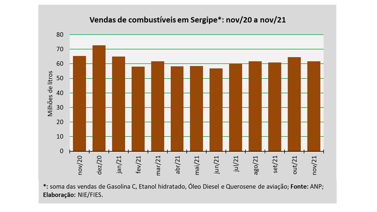 Análise realizada pelo Núcleo de Informações Econômicas da Federação das Indústrias do Estado de Sergipe (FIES), com base nos dados da Agência Nacional do Petróleo, Gás Natural e Biocombustíveis (ANP), indicou que as vendas totais de combustíveis em Sergipe, em novembro de 2021, totalizaram 61,7 milhões de litros, assinalando uma redução de 5,6% quando comparado a novembro de 2020. Em relação ao mês imediatamente anterior (outubro/2021), as vendas reduziram 4,2%.