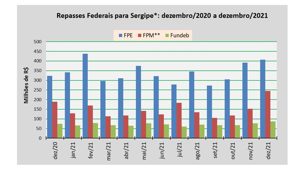 Análise realizada pelo Núcleo de Informações Econômicas da Federação das Indústrias do Estado de Sergipe (FIES), com base nos dados da Secretaria do Tesouro Nacional (STN), indicou que o repasse do Fundo de Participação dos Estados (FPE) para Sergipe, em dezembro de 2021, foi de aproximadamente R$ 407,4 milhões.