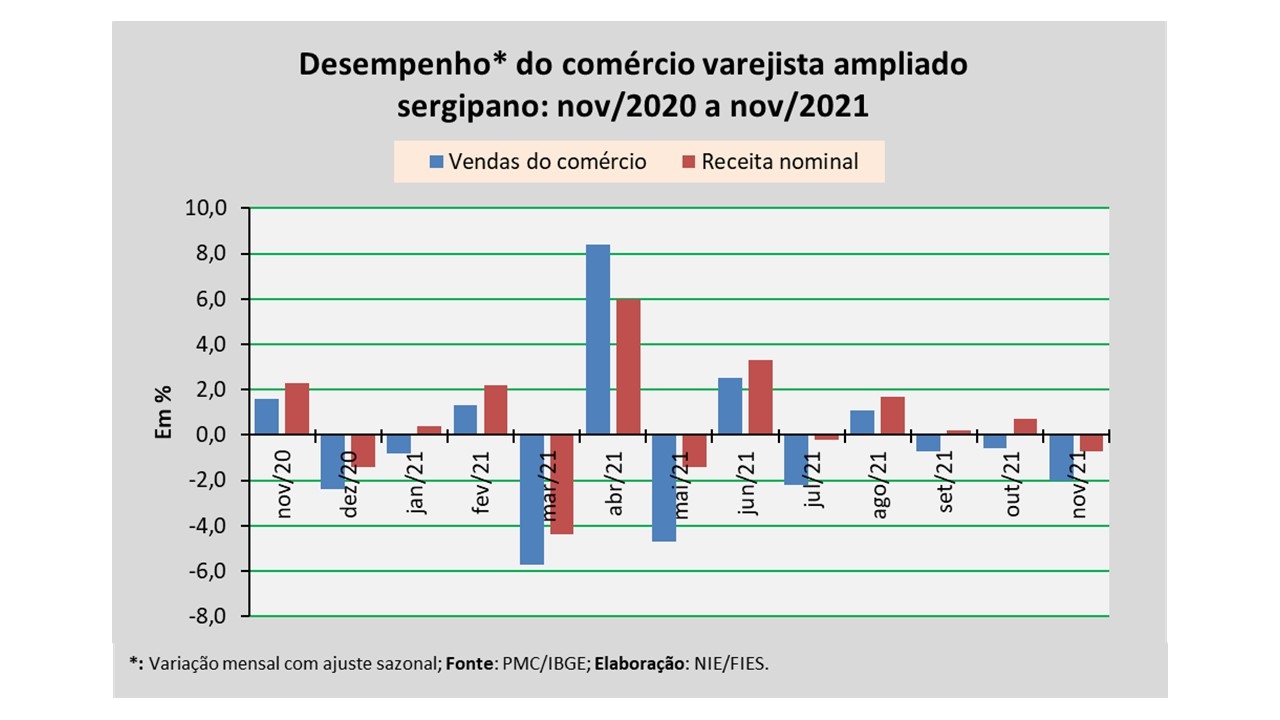 Análise realizada pelo Núcleo de Informações Econômicas da Federação das Indústrias do Estado de Sergipe (FIES), com base nos dados da Pesquisa Mensal do Comércio (PMC) do IBGE, apontou que as vendas do comércio varejista ampliado sergipano, em novembro de 2021, assinalaram redução de 2,0%, em relação ao mês imediatamente anterior (outubro/2021), na série com ajuste sazonal (método que uniformiza os períodos de comparação). No comparativo com novembro de 2020, observou-se decréscimo de 4,1%.