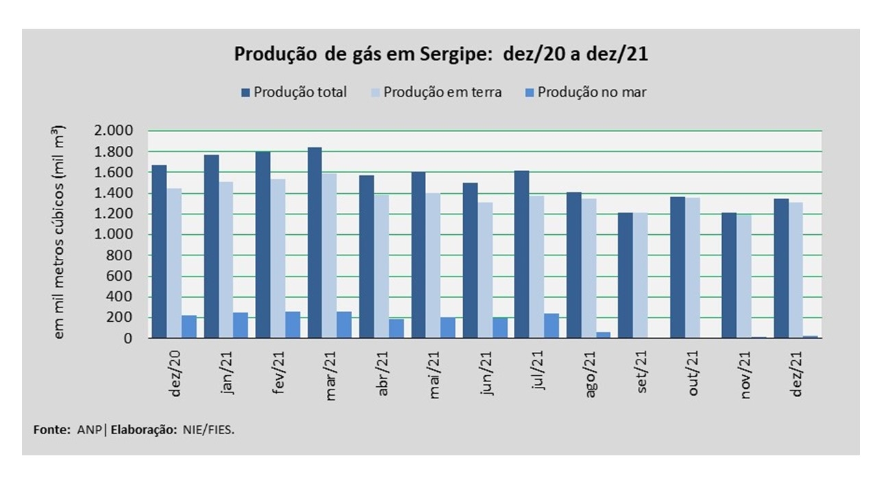 A produção em terra foi a principal fonte de produção de gás natural no estado, totalizando 1,3 milhão de metros cúbicos (m³), no período analisado. Esse volume correspondeu a 97,9% do total produzido em dezembro de 2021 no estado, ao passo que a produção em mar foi de 28 mil metros cúbicos (m³), representando 2,1% da produção.