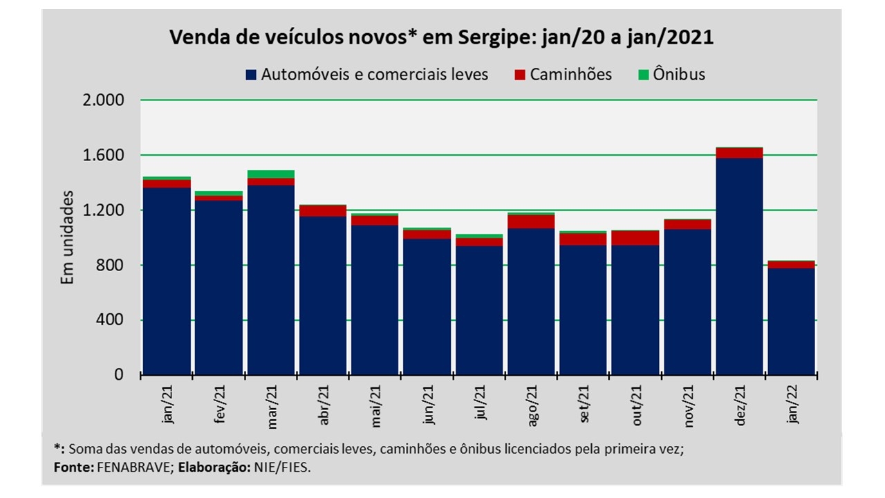 Análise realizada pelo Núcleo de Informações Econômicas (NIE) da Federação das Indústrias do Estado de Sergipe (FIES), com base nos dados da Federação Nacional da Distribuição de Veículos Automotores (FENABRAVE), apontou que as vendas de veículos novos no estado, no primeiro mês do ano, totalizaram 833 unidades.
