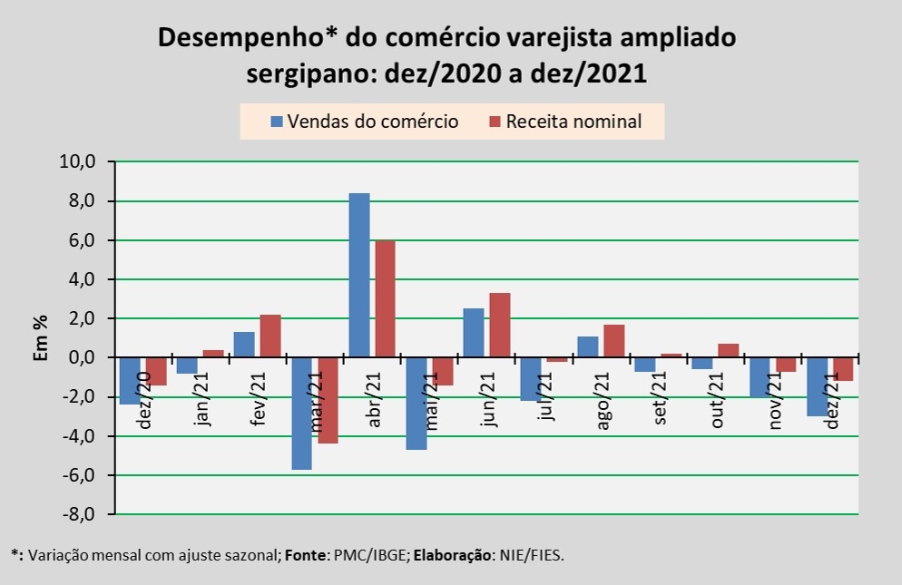 Análise realizada pelo Núcleo de Informações Econômicas da Federação das Indústrias do Estado de Sergipe (FIES), com base nos dados da Pesquisa Mensal do Comércio (PMC) do IBGE, apontou que as vendas do comércio varejista ampliado sergipano, em dezembro de 2021, assinalaram redução de 3,0%, em relação ao mês imediatamente anterior (novembro/2021), na série com ajuste sazonal (método que uniformiza os períodos de comparação). No comparativo com dezembro de 2020, observou-se decréscimo de 8,5% e no acumulado de 2021 o crescimento registrado foi de 6,1%, em relação ao ano de 2020