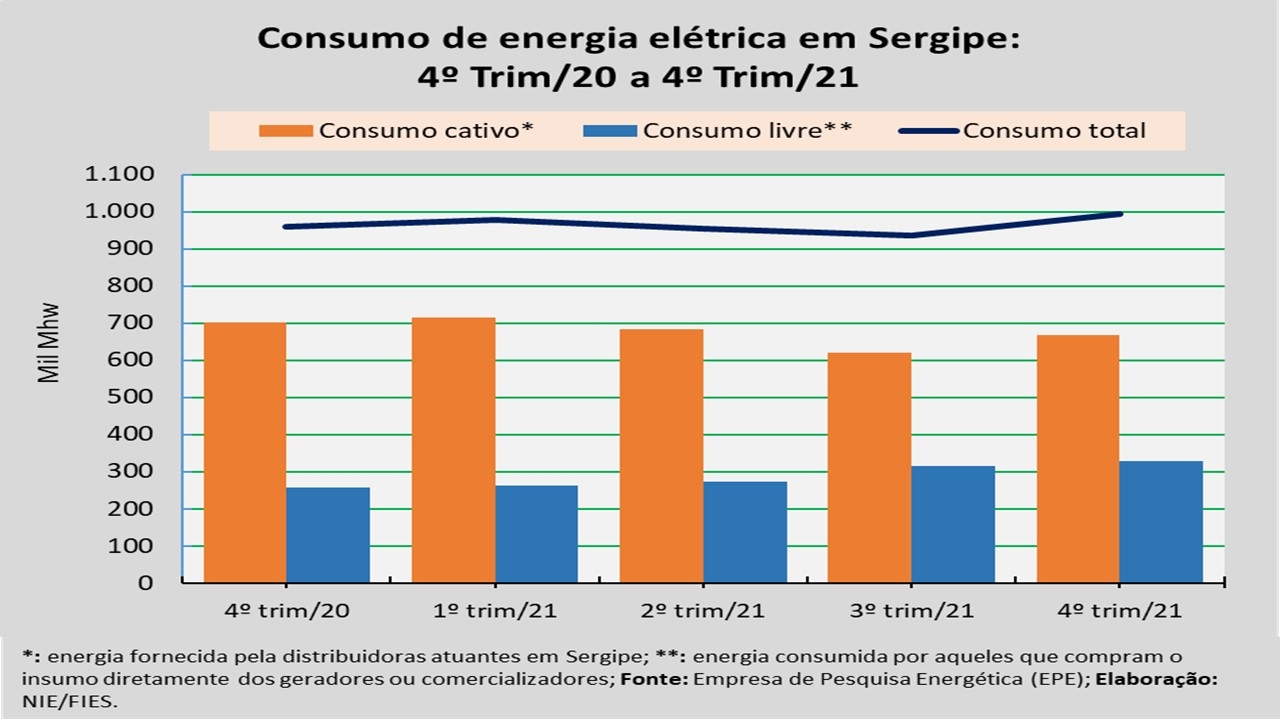 Da quantidade total de energia consumida no quarto trimestre do ano que findou, 67,1% ou 666,2 mil MWh foi proveniente do mercado cativo. Nesse mercado, a energia é fornecida exclusivamente pelas distribuidoras instaladas em Sergipe, com o preço e as demais condições de fornecimento reguladas pela Agência Nacional de Energia Elétrica (ANEEL).