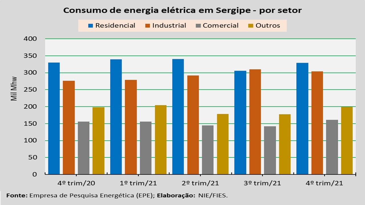 Análise realizada pelo Núcleo de Informações Econômicas da Federação das Indústrias do Estado de Sergipe (FIES), com base nos dados da Empresa de Pesquisa Energética (EPE) que tem por finalidade prestar serviços ao Ministério de Minas e Energia (MME), constatou que o consumo de energia elétrica no estado totalizou aproximadamente 993,5 mil MWh (Megawatt-hora), no quarto trimestre de 2021.