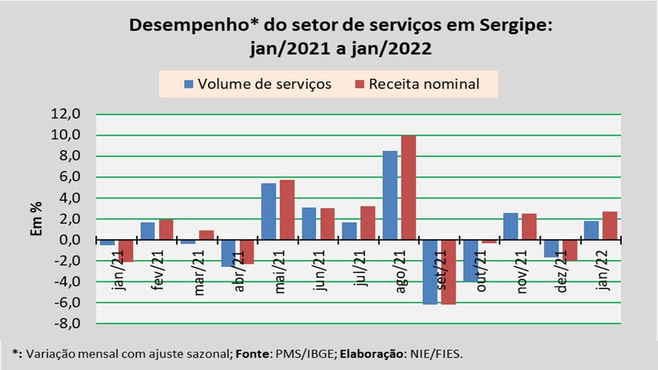 Análise realizada pelo Núcleo de Informações Econômicas da Federação das Indústrias do Estado de Sergipe (FIES), com base nos dados da Pesquisa Mensal de Serviços (PMS) do IBGE, revelou que, em janeiro, o setor de serviços em Sergipe apresentou crescimento de 1,8% no volume de serviços prestados, em relação ao último mês de dezembro, na série com ajuste sazonal (método utilizado para uniformizar os períodos de comparação). Na comparação com janeiro de 2021, o volume de serviços assinalou crescimento de 10,4%.