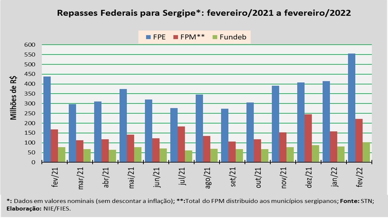 Análise realizada pelo Núcleo de Informações Econômicas da Federação das Indústrias do Estado de Sergipe (FIES), com base nos dados da Secretaria do Tesouro Nacional (STN), indicou que o repasse do Fundo de Participação dos Estados (FPE) para Sergipe, em fevereiro do ano corrente, foi de R$ 554,8 milhões.