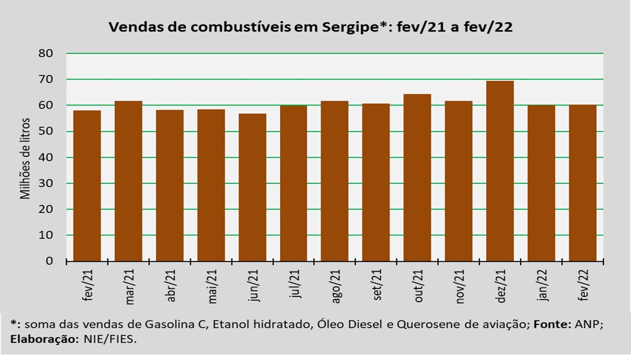 Análise realizada pelo Núcleo de Informações Econômicas da Federação das Indústrias do Estado de Sergipe (FIES), com base nos dados da Agência Nacional do Petróleo, Gás Natural e Biocombustíveis (ANP), indicou que as vendas totais de combustíveis em Sergipe, em fevereiro de 2022, totalizaram 60,2 milhões de litros, assinalando crescimento de 3,6% quando comparado a fevereiro de 2021. Em relação ao mês imediatamente anterior (janeiro/2022), as vendas aumentaram 0,1%.