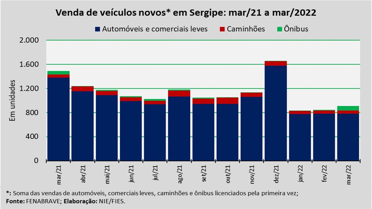 Análise realizada pelo Núcleo de Informações Econômicas (NIE) da Federação das Indústrias do Estado de Sergipe (FIES), com base nos dados da Federação Nacional da Distribuição de Veículos Automotores (FENABRAVE), apontou que as vendas de veículos novos no estado, no mês de março, totalizaram 911 unidades.