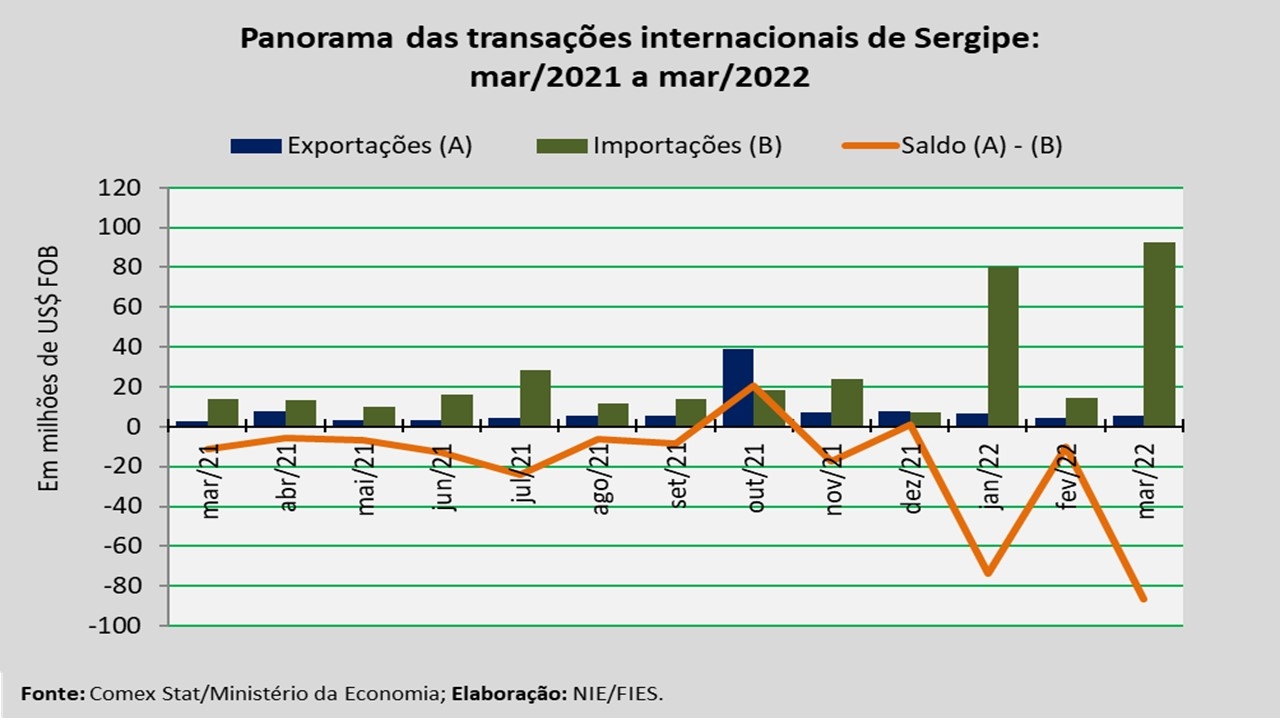 Análise realizada pelo Centro Internacional de Negócios – CIN/SE, da Federação das Indústrias do Estado de Sergipe (FIES), com base nos dados do Comex Stat, sistema para consultas e extração de dados do comércio exterior brasileiro, disponibilizado pelo Ministério da Economia, apontou que as exportações sergipanas, em março deste ano, somaram aproximadamente US$ 5,7 milhões. O montante registrado representa aumento de 37,4%, quando comparado com o mês anterior, fevereiro último. Já em relação a março de 2021, verificou-se crescimento de 112,1%.