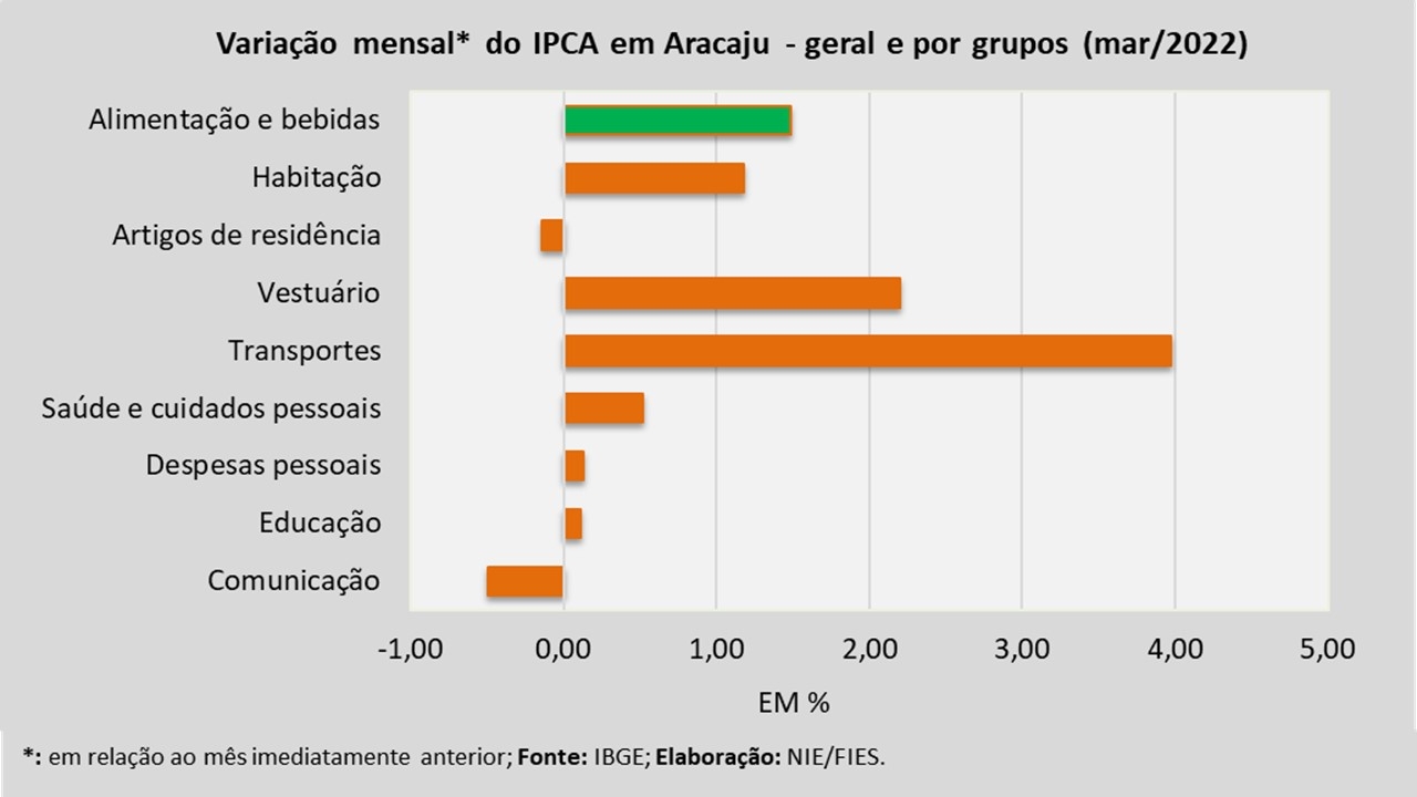 Nove grupos de produtos e serviços foram pesquisados para medir o comportamento dos preços, em Aracaju, apenas dois apresentaram variação negativa de preço no período analisado, o grupo de Comunicação (-0,49%) e Artigos de Residência (-0,14%).