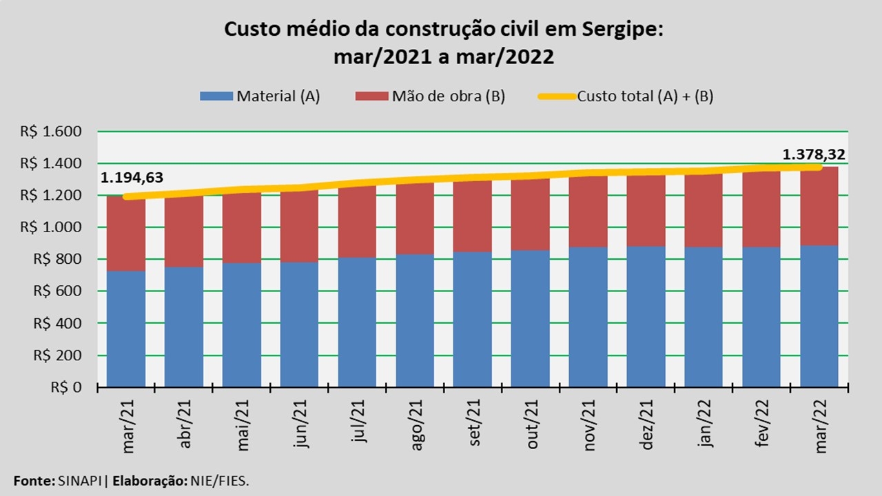 Análise realizada pelo Núcleo de Informações Econômicas da Federação das Indústrias do Estado de Sergipe (FIES), com base nos dados do Sistema Nacional de Pesquisa de Custos e Índices da Construção Civil – SINAPI, uma produção conjunta do IBGE e da Caixa Econômica Federal, revelou que o custo médio da construção em Sergipe, por metro quadrado (m²), em março deste ano, registrou aumento de 0,5%, quando comparado com o mês imediatamente anterior, fevereiro último. Na comparação com o mês de março do ano passado, o custo registrado apresentou crescimento de 15,4%.