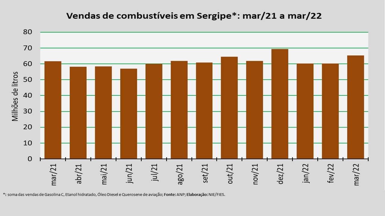 Análise realizada pelo Núcleo de Informações Econômicas da Federação das Indústrias do Estado de Sergipe (FIES), com base nos dados da Agência Nacional do Petróleo, Gás Natural e Biocombustíveis (ANP), indicou que as vendas totais de combustíveis em Sergipe, em março de 2022, totalizaram 65,3 milhões de litros, assinalando crescimento de 6,0% quando comparado a março de 2021. Em relação ao mês imediatamente anterior (fevereiro/2022), as vendas aumentaram 8,5%.