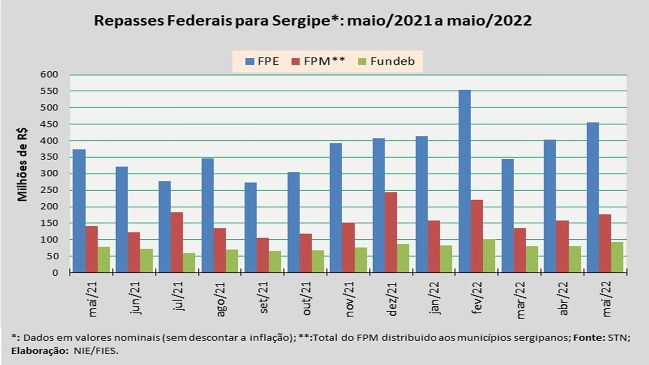 Análise realizada pelo Núcleo de Informações Econômicas da Federação das Indústrias do Estado de Sergipe (FIES), com base nos dados da Secretaria do Tesouro Nacional (STN), indicou que o repasse do Fundo de Participação dos Estados (FPE) para Sergipe, em maio do ano corrente, foi de aproximadamente R$ 454,6 milhões.