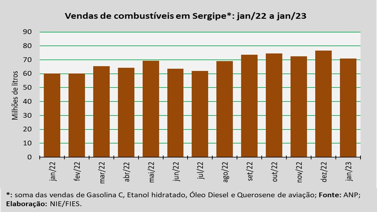 Análise realizada pelo Núcleo de Informações Econômicas da Federação das Indústrias do Estado de Sergipe (FIES), com base nos dados da Agência Nacional do Petróleo, Gás Natural e Biocombustíveis (ANP), indicou que as vendas totais de combustíveis em Sergipe, em janeiro de 2023, totalizaram 70,9 milhões de litros, assinalando um acréscimo de 18,0% quando comparado a janeiro de 2022. Em relação ao mês imediatamente anterior (dezembro/2022), as vendas reduziram 7,5%.