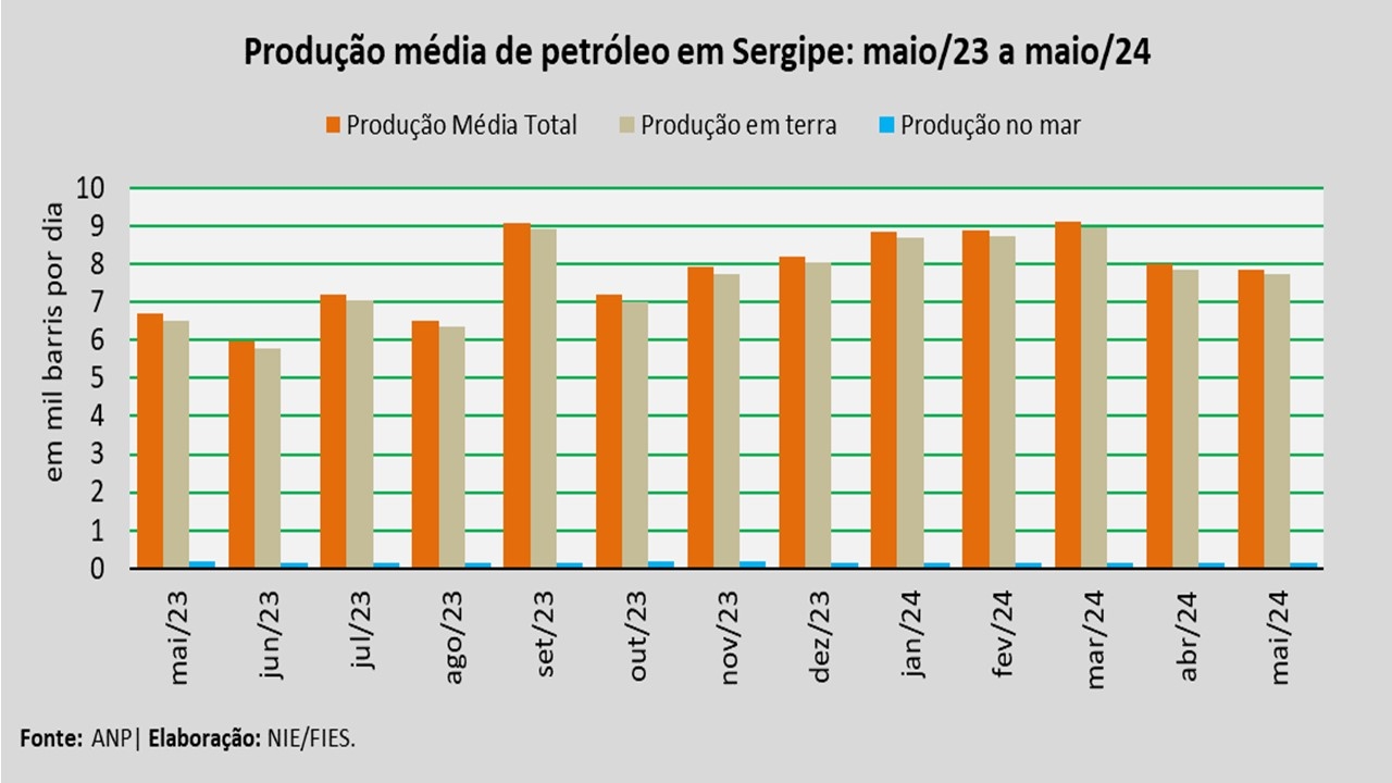 Análise realizada pelo Núcleo de Informações Econômicas da Federação das Indústrias do Estado de Sergipe (FIES), com base nos dados da Agência Nacional do Petróleo, Gás Natural e Biocombustíveis (ANP), revelou que a produção de petróleo no estado, no mês de maio, alcançou, em média, 7,9 mil barris por dia (bpd), registrando redução de 1,8% em relação à produção média do mês anterior (abril/2024). No comparativo com maio de 2023, verificou-se acréscimo de 17,5%. Com o total produzido em maio, a produção acumulada ao longo de 2024 atingiu cerca de 42,7 mil barris, um crescimento de 50,1% no comparativo com o mesmo período de 2023.