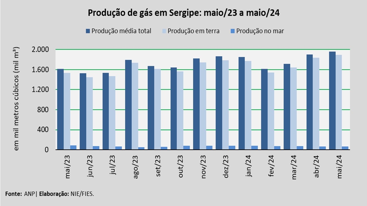 A produção em terra foi a principal fonte de produção de gás natural no estado, totalizando cerca de 1,89 milhão de metros cúbicos (m³), no período analisado. Esse volume correspondeu a 96,5% do total produzido no mês de maio, ao passo que a produção em mar foi de 69 mil metros cúbicos (m³), representando 3,5% da produção.