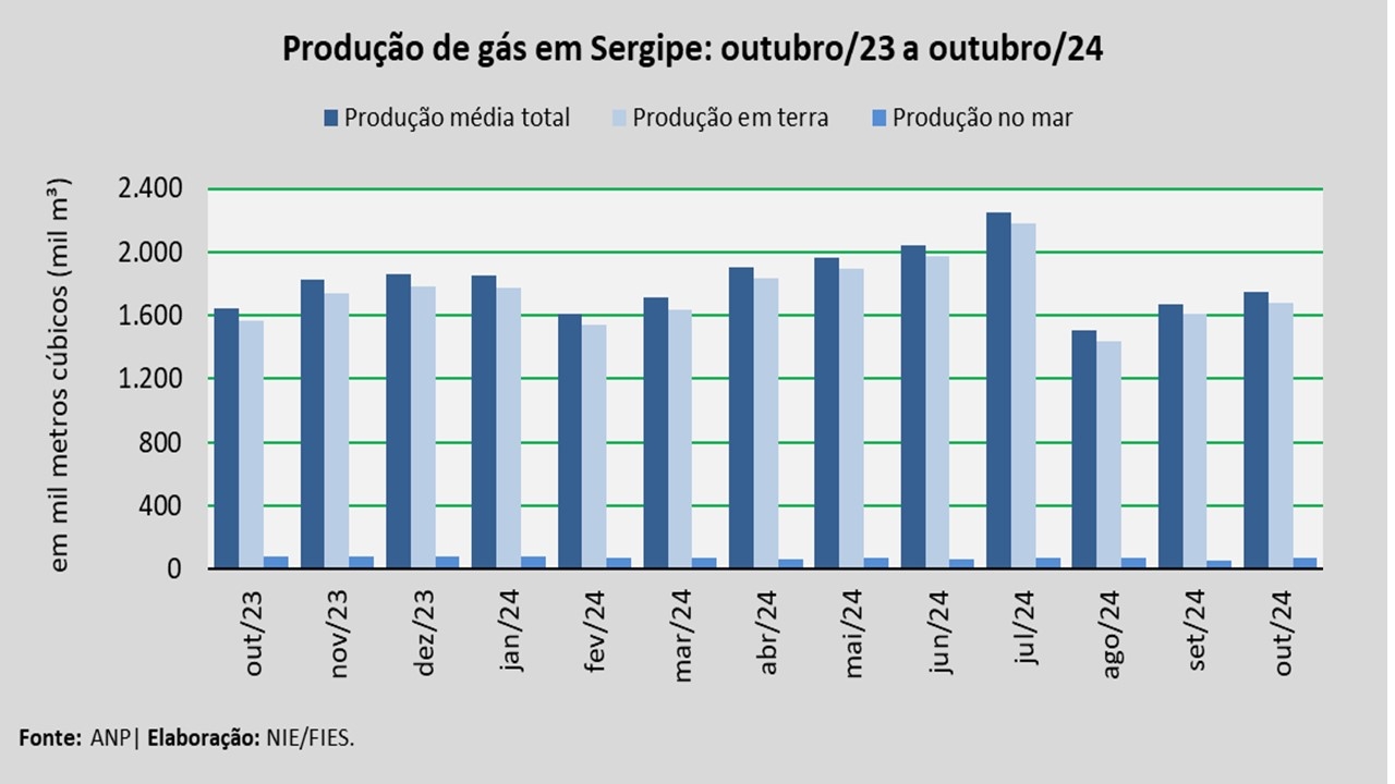 A produção em terra foi a principal fonte de produção de gás natural no estado, totalizando aproximadamente 1,68 milhão de metros cúbicos (m³), no período analisado. Esse volume correspondeu a 96,0% do total produzido no mês de outubro, ao passo que a produção em mar foi de 69 mil metros cúbicos (m³), representando 4,0% da produção.