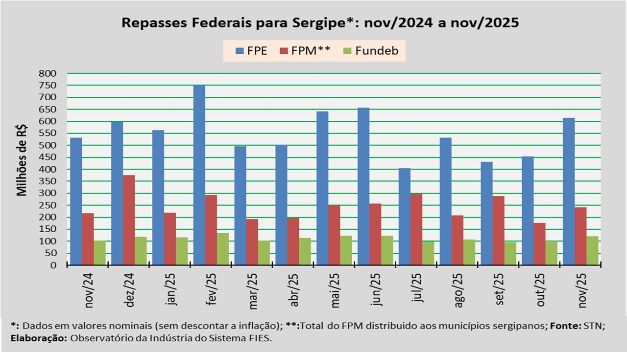 Análise realizada pelo Observatório da Indústria do Sistema FIES, com base nos dados da Secretaria do Tesouro Nacional (STN), indicou que o repasse do Fundo de Participação dos Estados (FPE) para Sergipe, em novembro do ano corrente, foi de aproximadamente R$ 615,5 milhões.