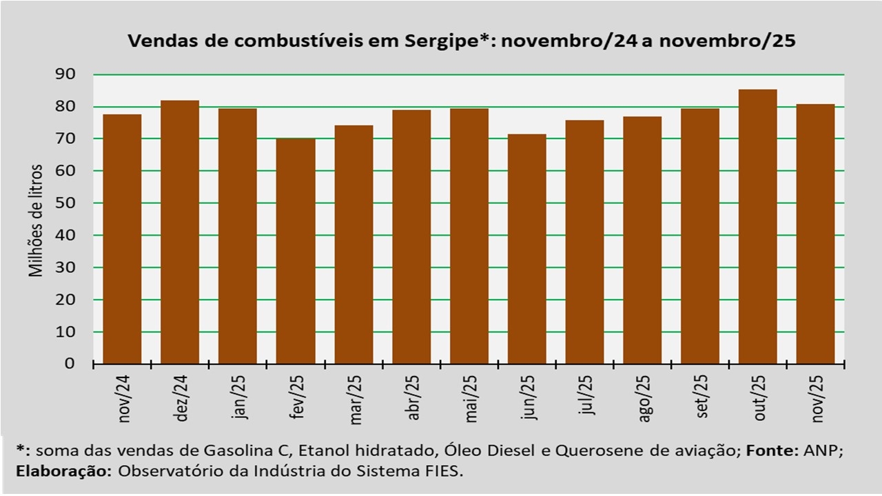 Análise realizada pelo Observatório da Indústria do Sistema FIES, com base nos dados da Agência Nacional do Petróleo, Gás Natural e Biocombustíveis (ANP), indicou que as vendas totais de combustíveis em Sergipe, em novembro de 2025, somaram aproximadamente 80,1 milhões de litros, assinalando um acréscimo de 4,3% quando comparado a novembro de 2024. Em relação ao mês imediatamente anterior (outubro/2025), as vendas diminuíram 5,2%.