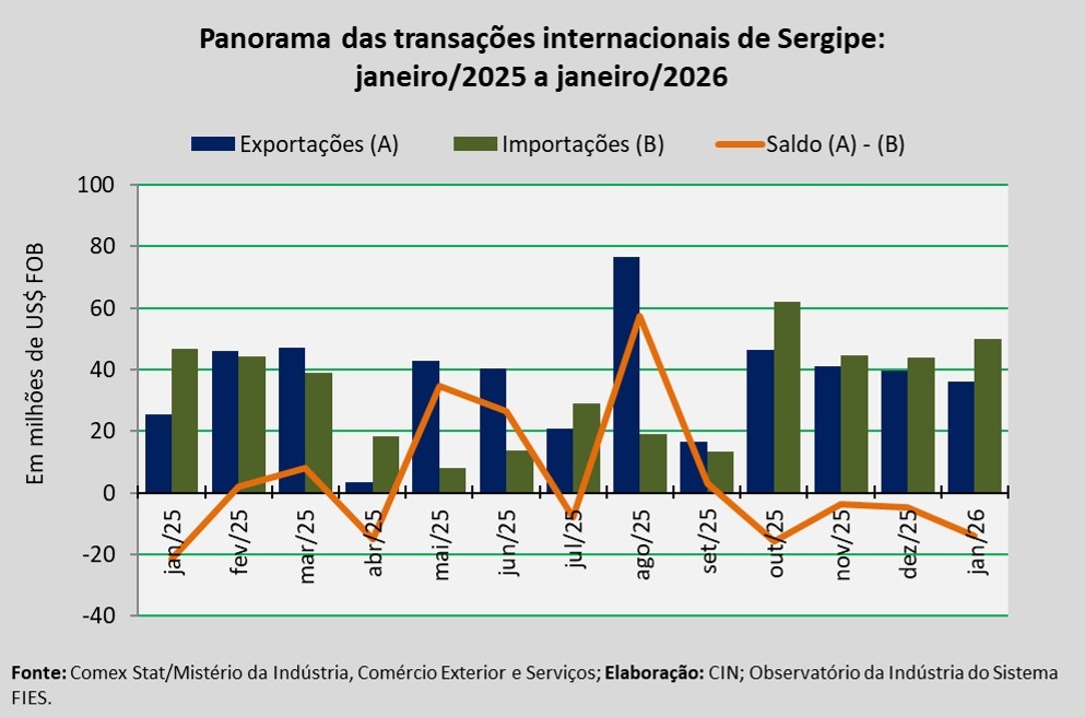 Análise realizada pelo Centro Internacional de Negócios – CIN/SE, da Federação das Indústrias do Estado de Sergipe (FIES), com base nos dados do Comex Stat, sistema para consultas e extração de dados do comércio exterior brasileiro, disponibilizado pelo Mistério da Indústria, Comércio Exterior e Serviços, apontou que as exportações sergipanas, em janeiro de 2026, somaram aproximadamente US$ 36,0 milhões. O montante registrado representa uma redução de 8,8%, quando comparado com o mês anterior, dezembro último.